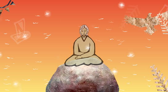 Glooscap se mit à voyager et aperçut une veille femme assise sur une roche. Il s’approcha et lui demanda : « Qui êtes-vous? D’où venez-vous? » La veille femme le regarda et dit : « Tu ne me reconnais pas? Je suis ta grand-mère. Je dois mon existence à cette roche sur le sol. De la rosée se forma sur cette roche tôt ce matin et, grâce au Donneur de vie, je reçus le corps d’une veille femme sage et savante. Si tu respectes ma sagesse et mon savoir, cette roche t’aidera à comprendre quelle est ta place dans le monde. »