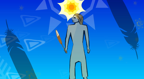 Debout, au milieu du cercle, il leva les yeux vers Grand-Père Soleil pour savoir ce qu’il faisait sur la Terre. Mais avant même de pouvoir lui demander, il vit un oiseau dessinant des cercles dans le ciel de midi. L’oiseau vint atterrir devant lui.