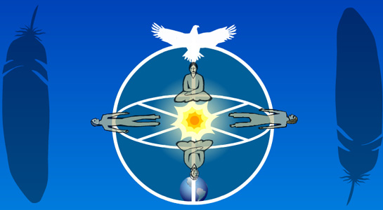 Ainsi, nous sommes au centre du monde, là où passe Grand-Père Soleil pour rejoindre note mère, la Terre. Ce centre est l’une des sept directions sacrées, parce que notre ombre est le lien qui unit le monde spirituel au
