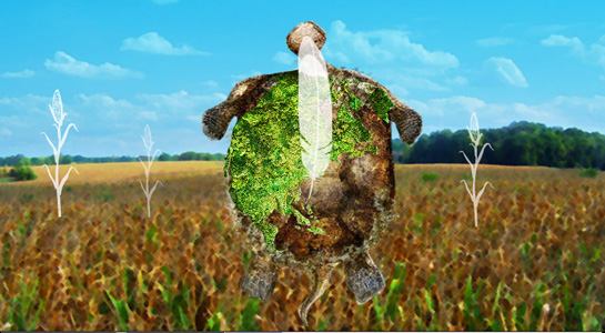 Quand nous disons « trois », en langue Mohawk, nous pensons au moment où la Femme du ciel a été posée au milieu du dos de la Grande Tortue. Notre mot pour le chiffre trois évoque donc l’idée d’être « au milieu ».